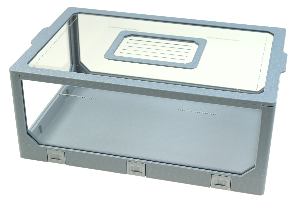 - Material: Durable 3D print combined with transparent plexiglass