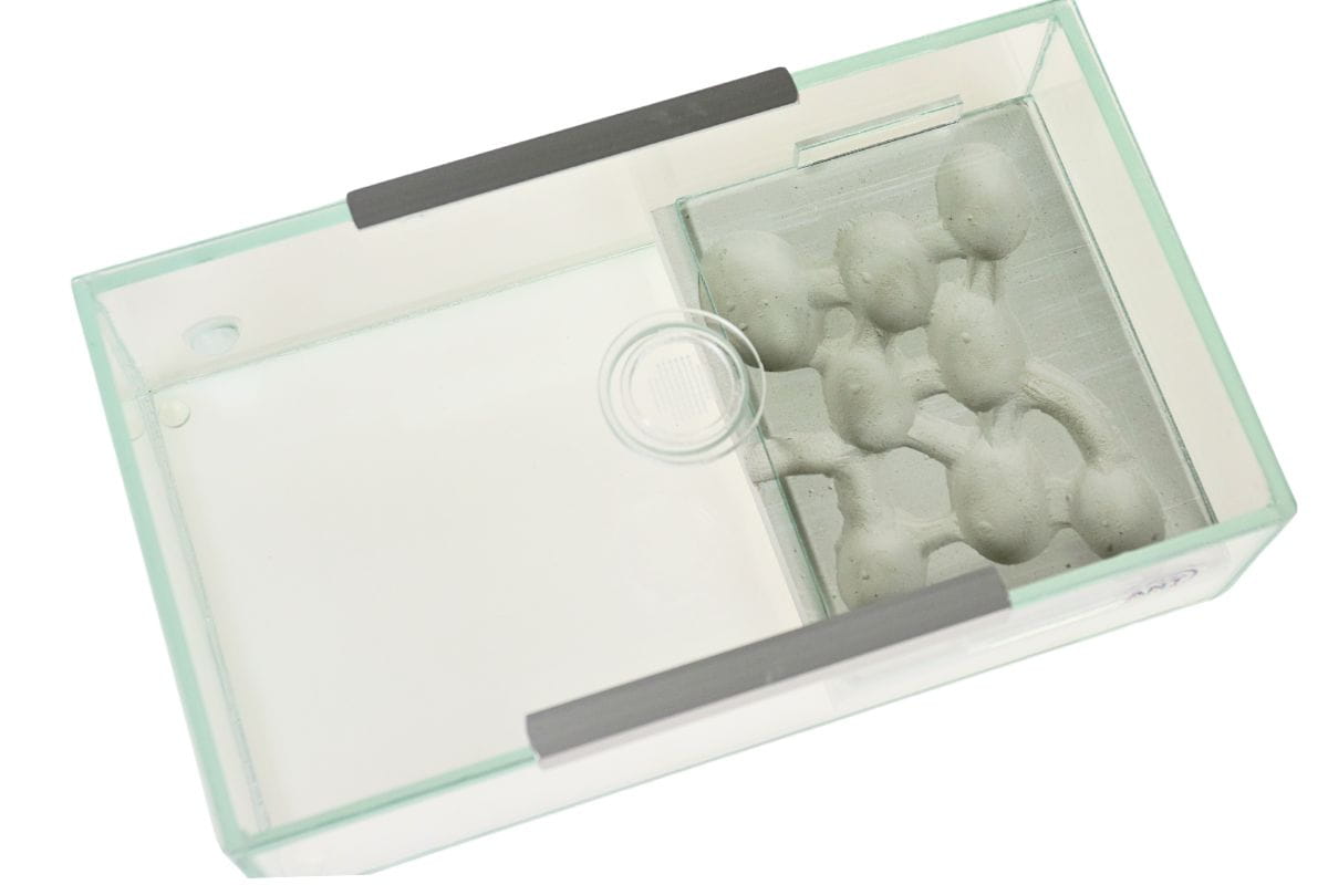Silicone bumpers are glued to the bottom of the formicarium to protect the surface from scratching.