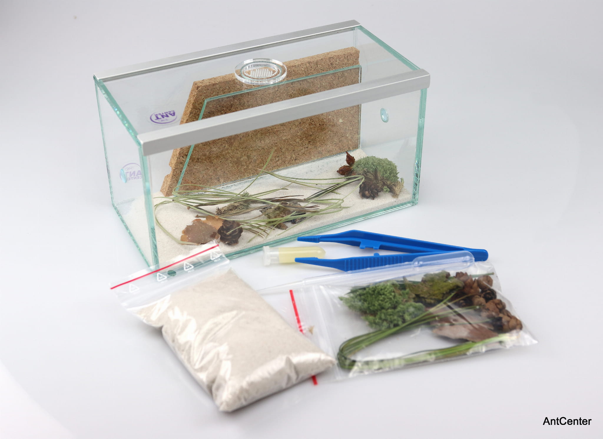 3) Formicarium decor: white quartz sand, elements of natural decor (cones, moss)